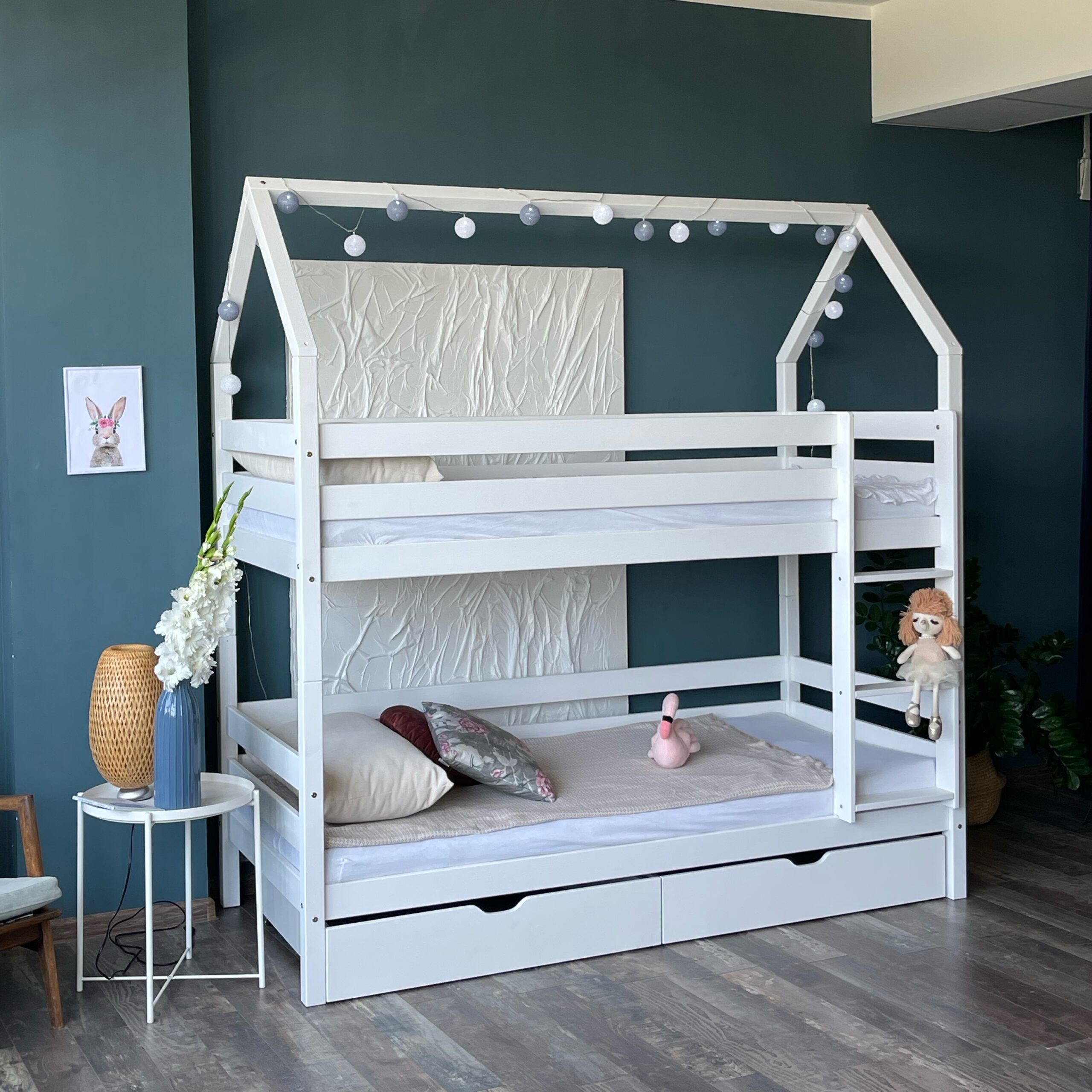 Двухъярусная кровать-домик «Мальта» из массива сосны 80Х180, 90×200 с ящиками