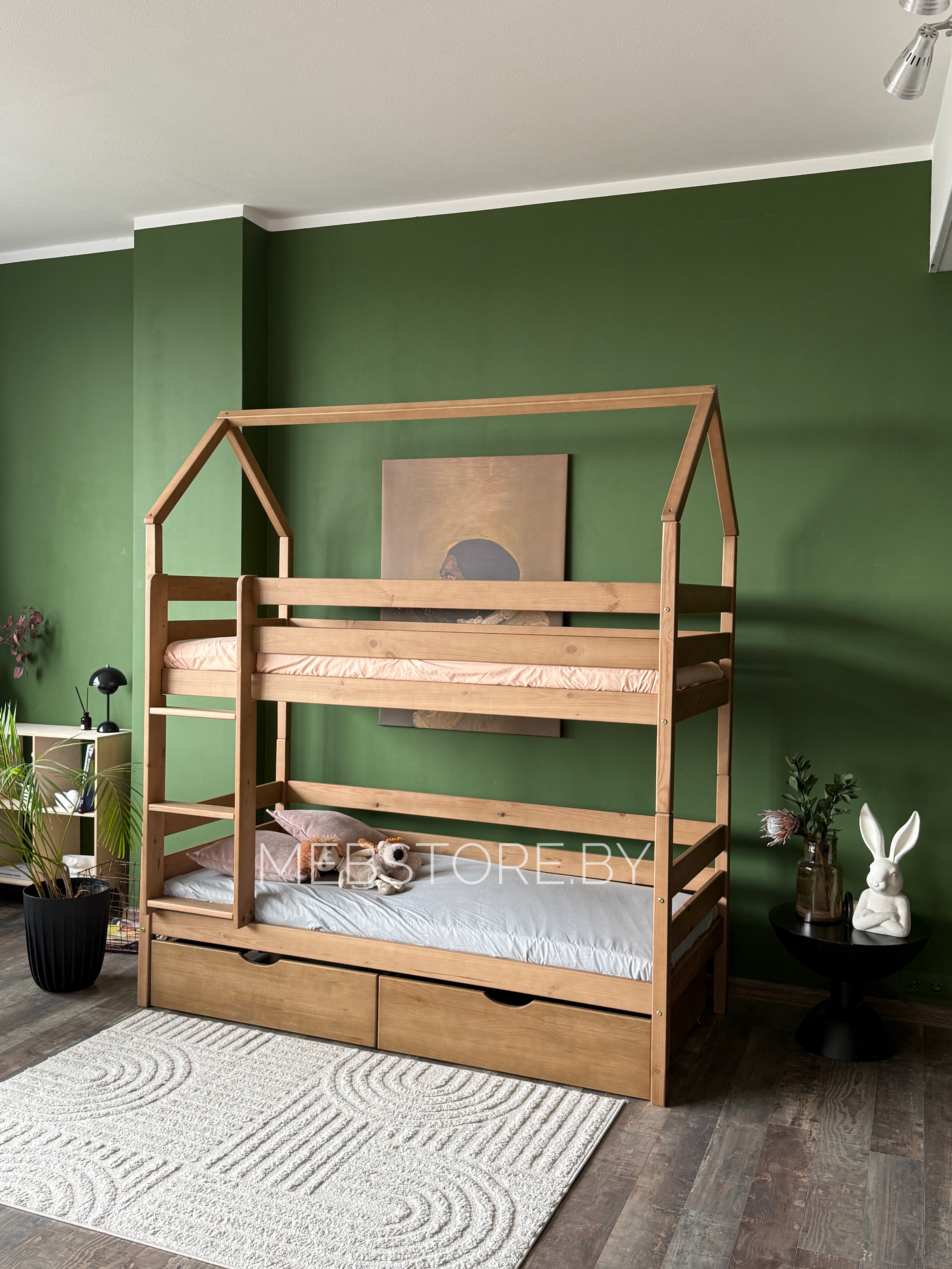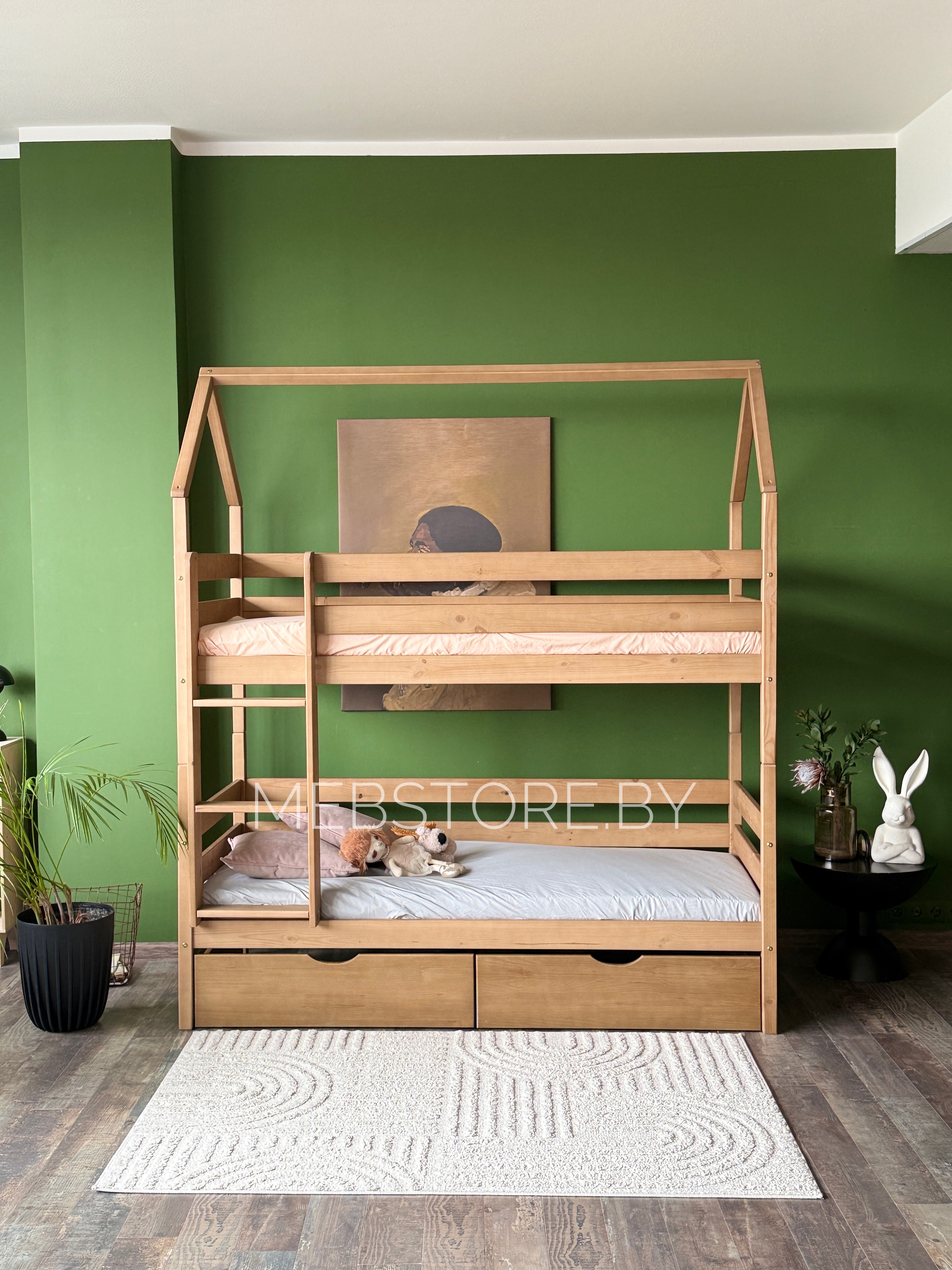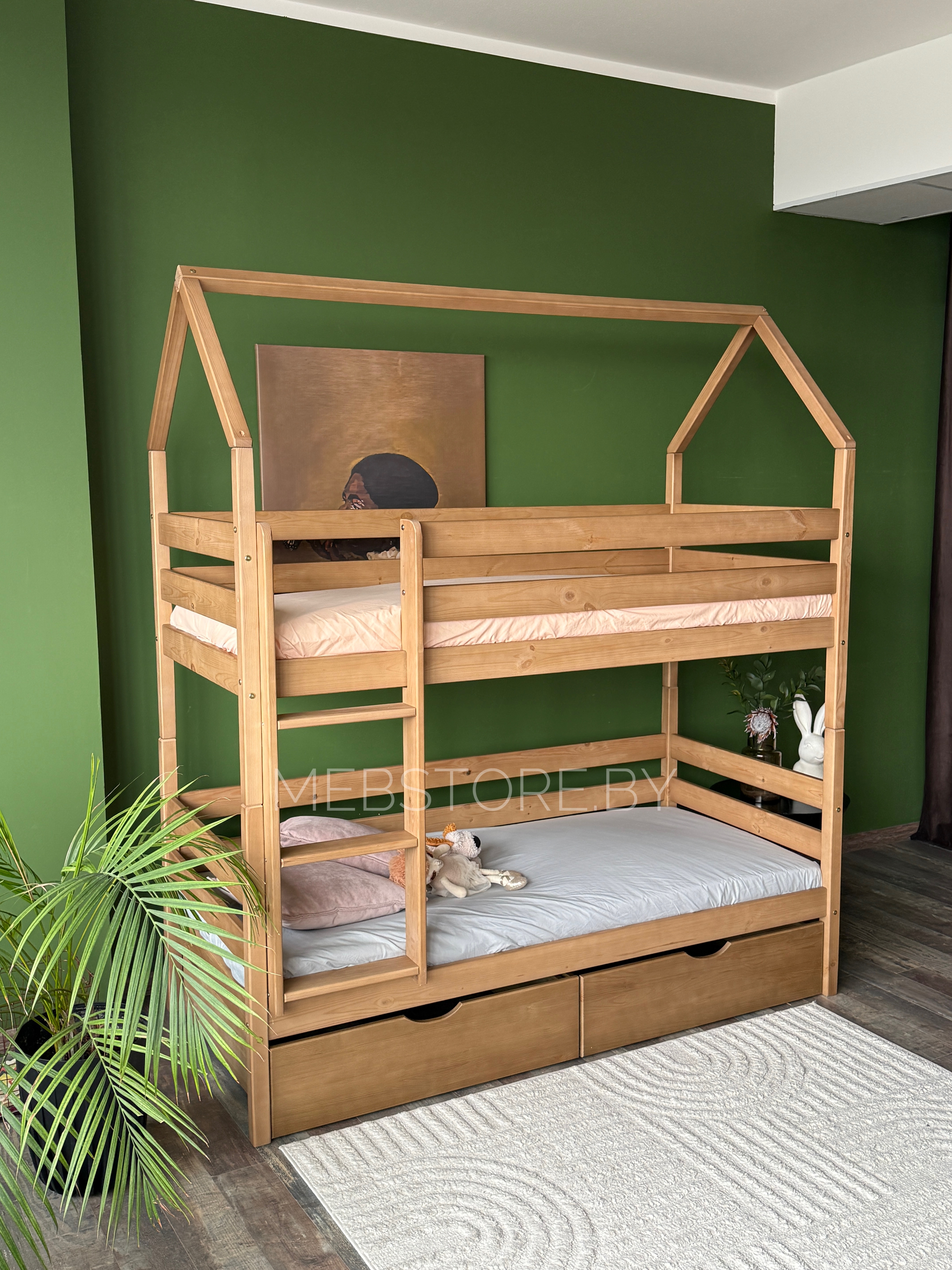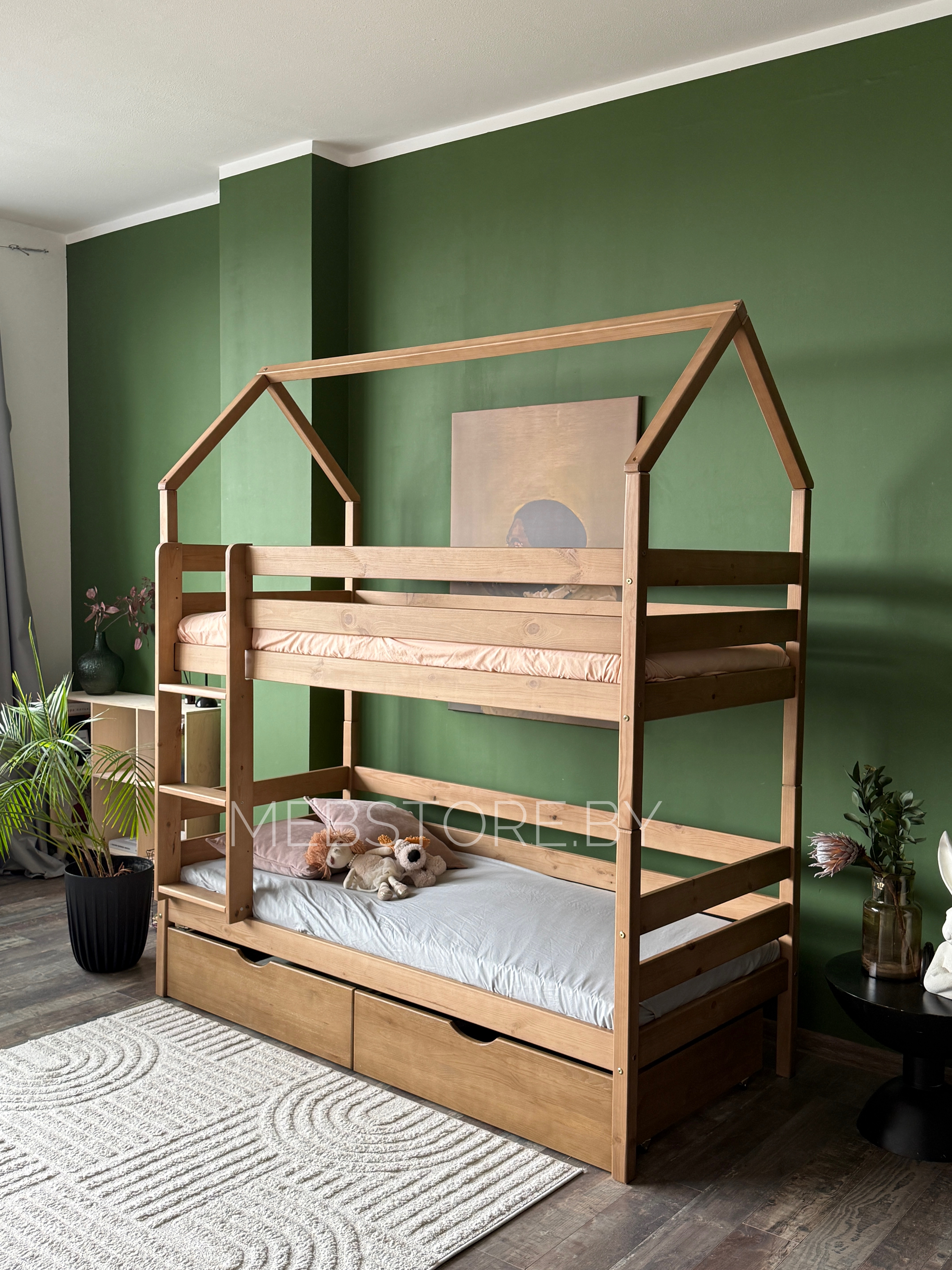 Двухъярусная кровать-домик «Мальта» из массива сосны 80×180, 90Х200 с ящиками цвет антик