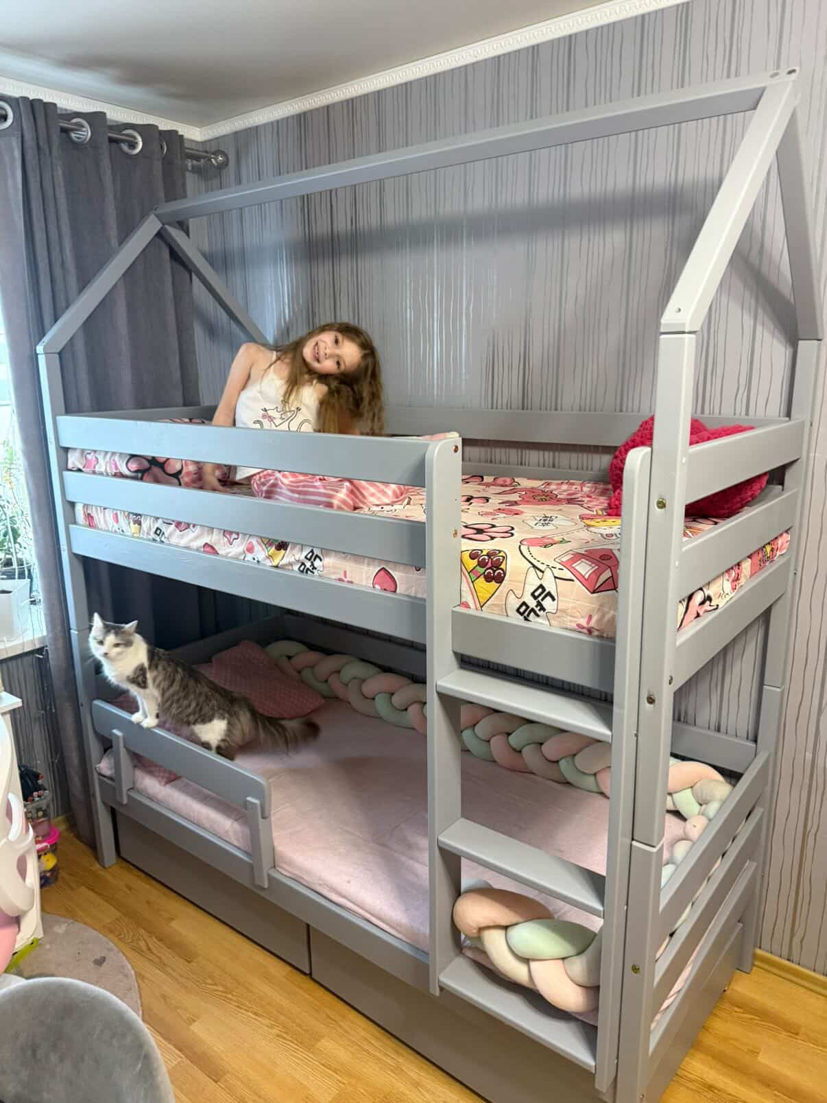 Двухъярусная кровать-домик «Мальта» из массива сосны без борта с ящиками цвет серый
