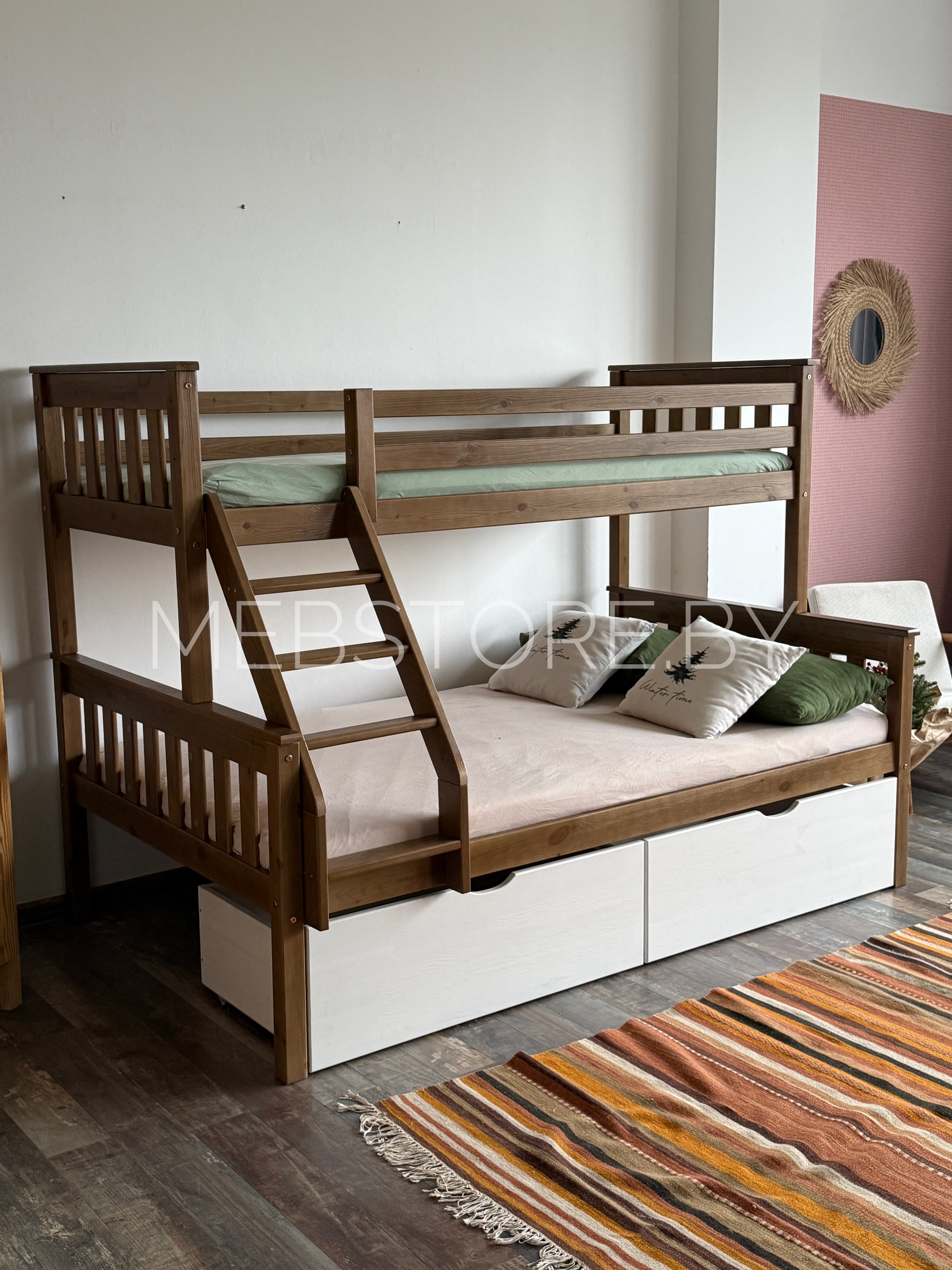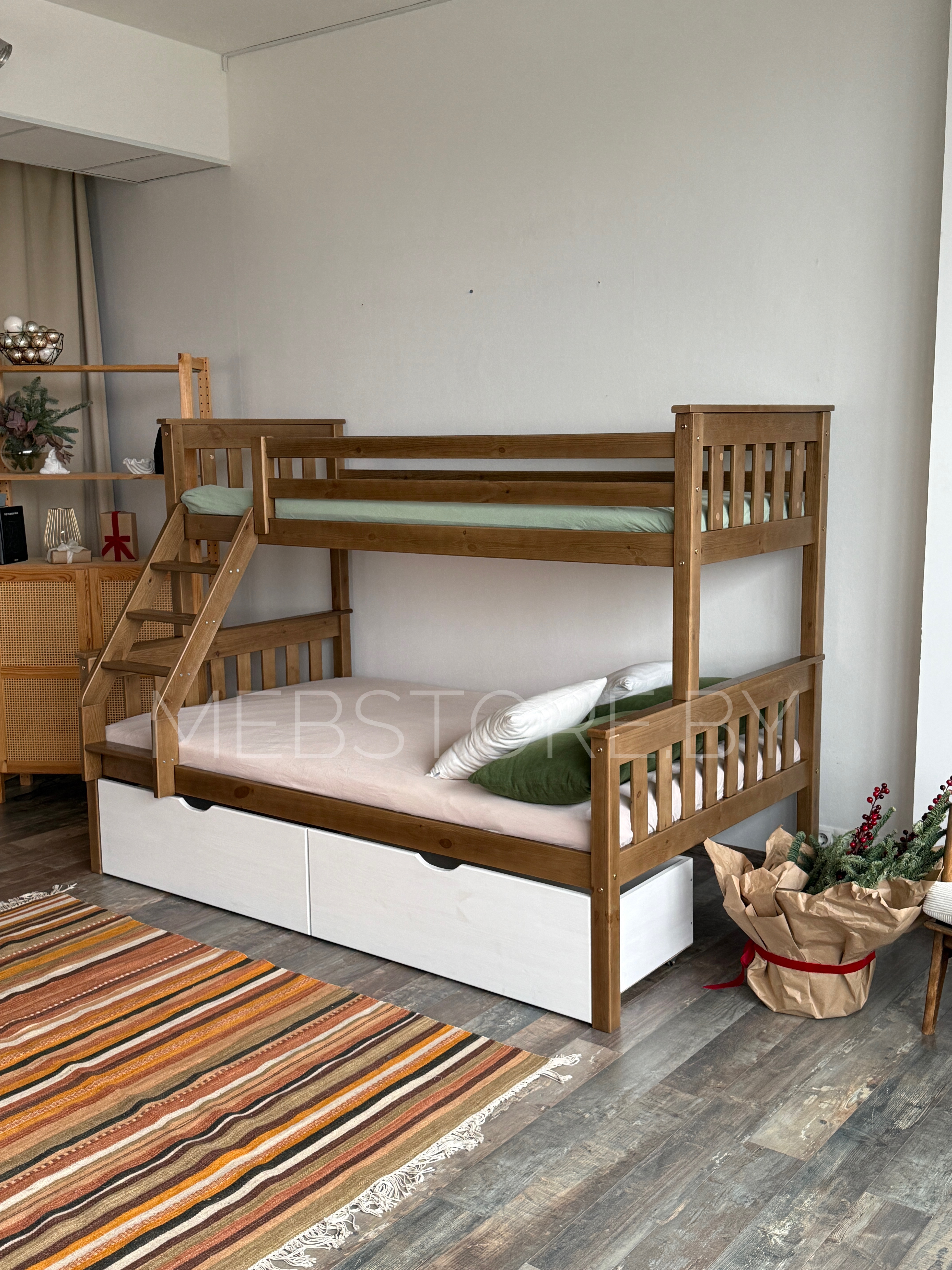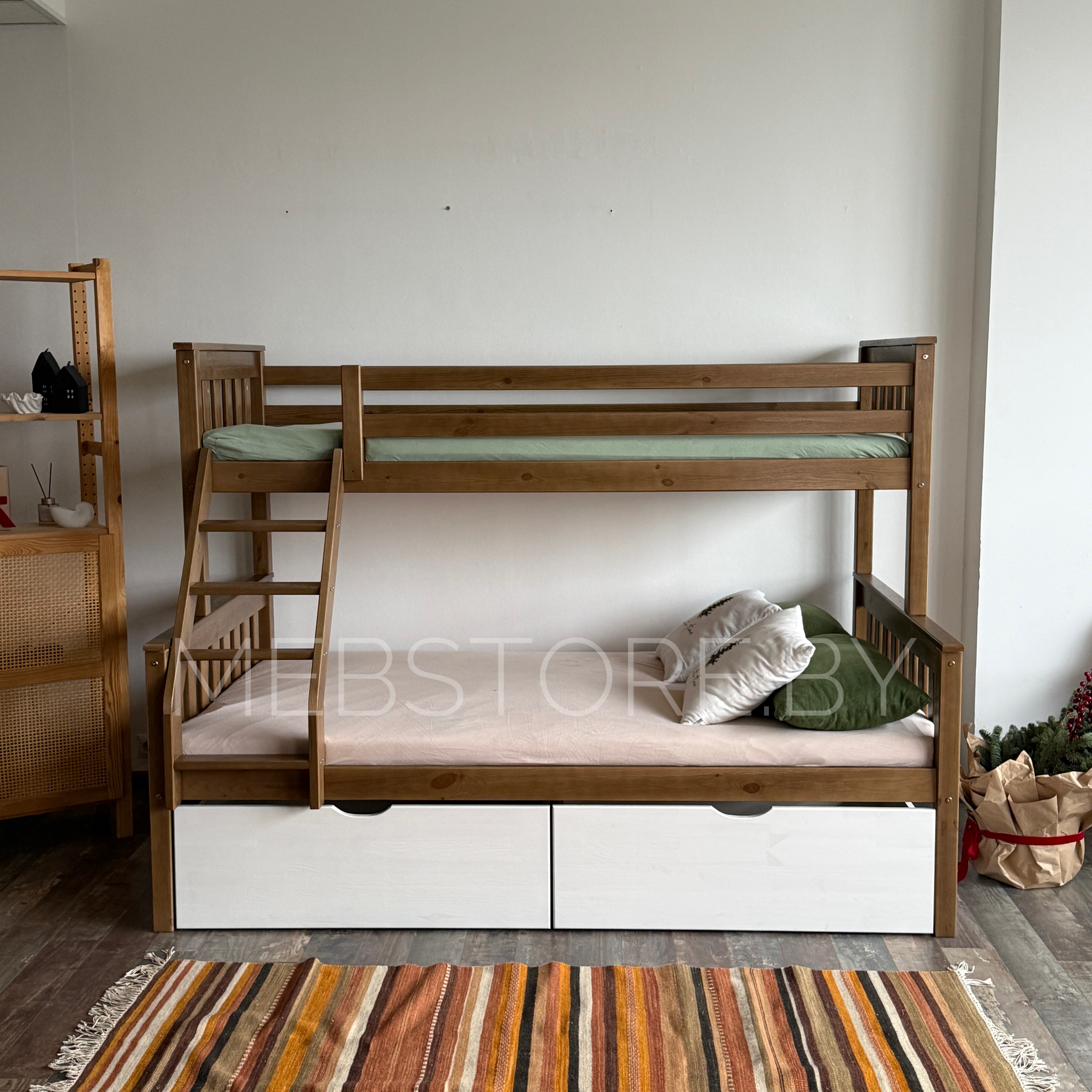 Двухъярусная кровать «Мальм-люкс»(антик) из массива сосны (с белыми ящиками) 90×200/140х200 и 80×200/120×200