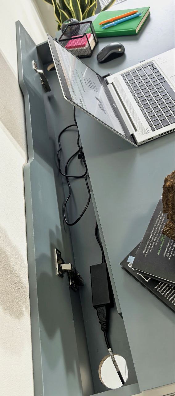 - Встроенное, легкодоступное хранилище для кабелей и проводов; в пределах легкой досягаемости, но вне поля зрения.
