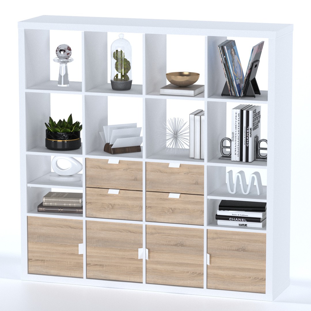 - Стеллаж превращается по необходимости в шкаф, за счет дополнительных комплектующих: дверца, полка, и два ящика.