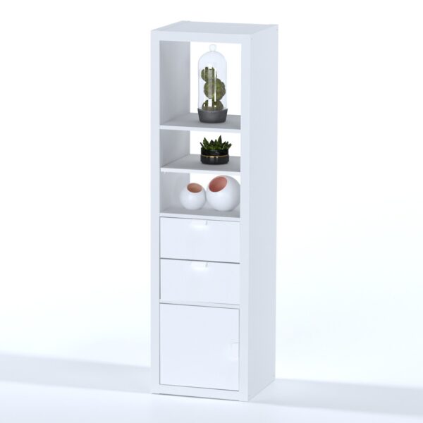 - Стеллаж может быть открыт или за счет дополнительных комплектующих: дверца, полка, и два ящика, закрыт.