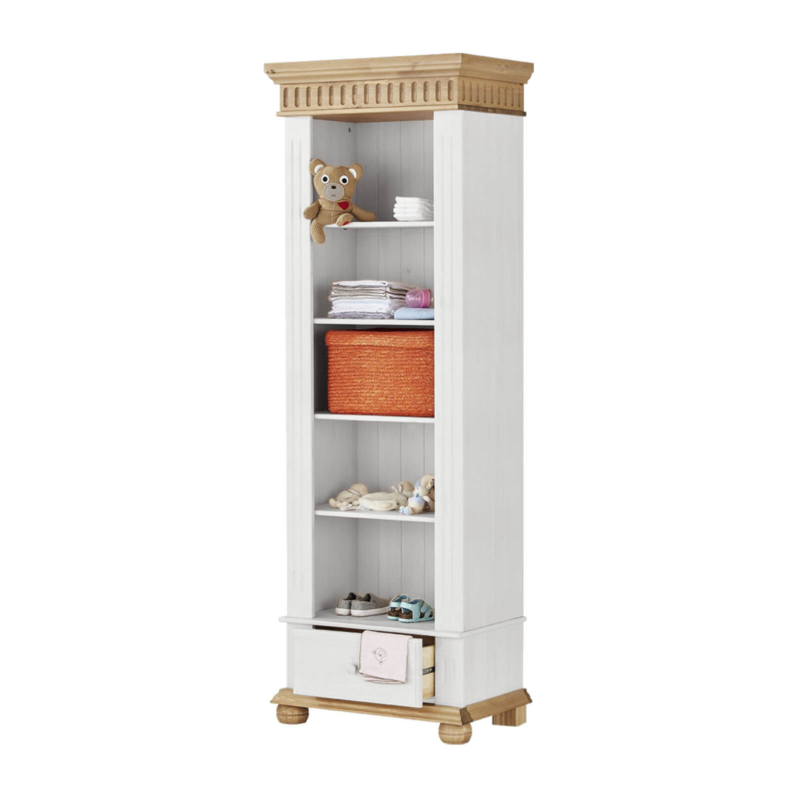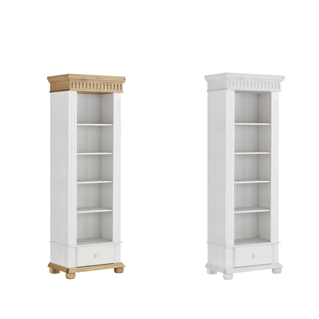 Стеллаж Хельсинки 01 из массива сосны, отлично впишется как в спальню, так и детскую. Ярко-белый шкаф, в котором легко просматривается структура дерева. Декоративные элементы лакированной сосны придают шкафу ностальгический вид. В стеллаже располагаются 4 регулируемые полки и ящик в нижней части.
